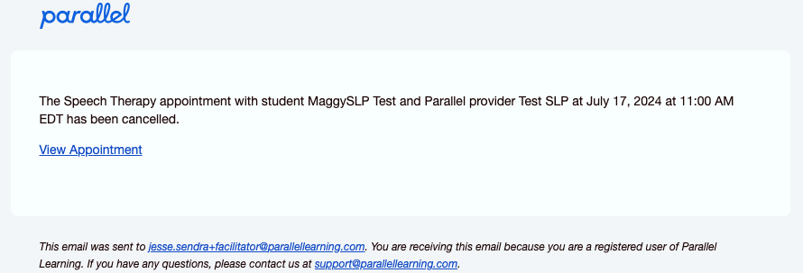 When a session is canceled, you will receive an email from Parallel Learning with the subject Parallel Appointment Canceled.