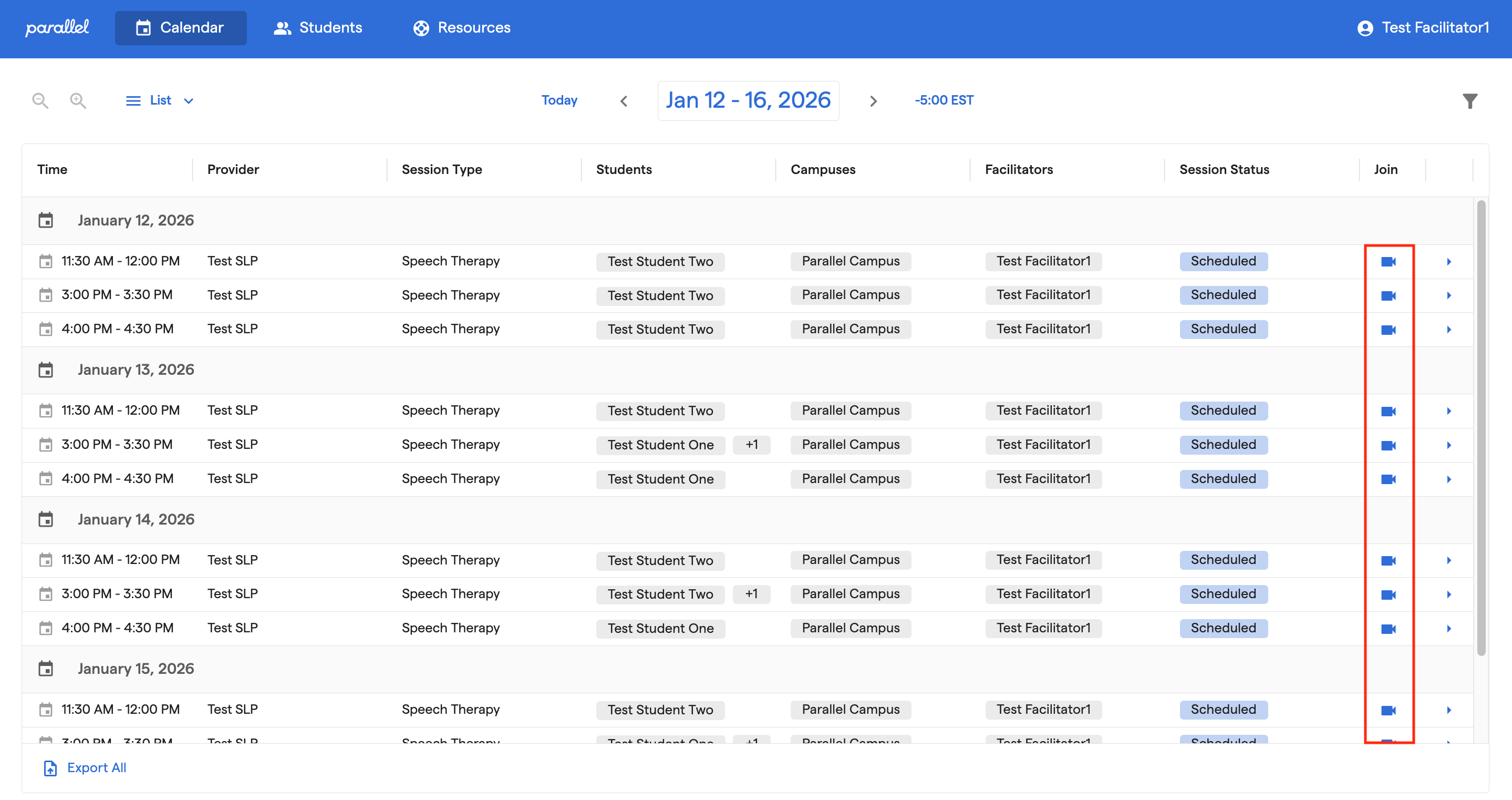 You can also access your sessions via the List View of the calendar by clicking the video camera icon to the very right of the associated session. This is shown below.