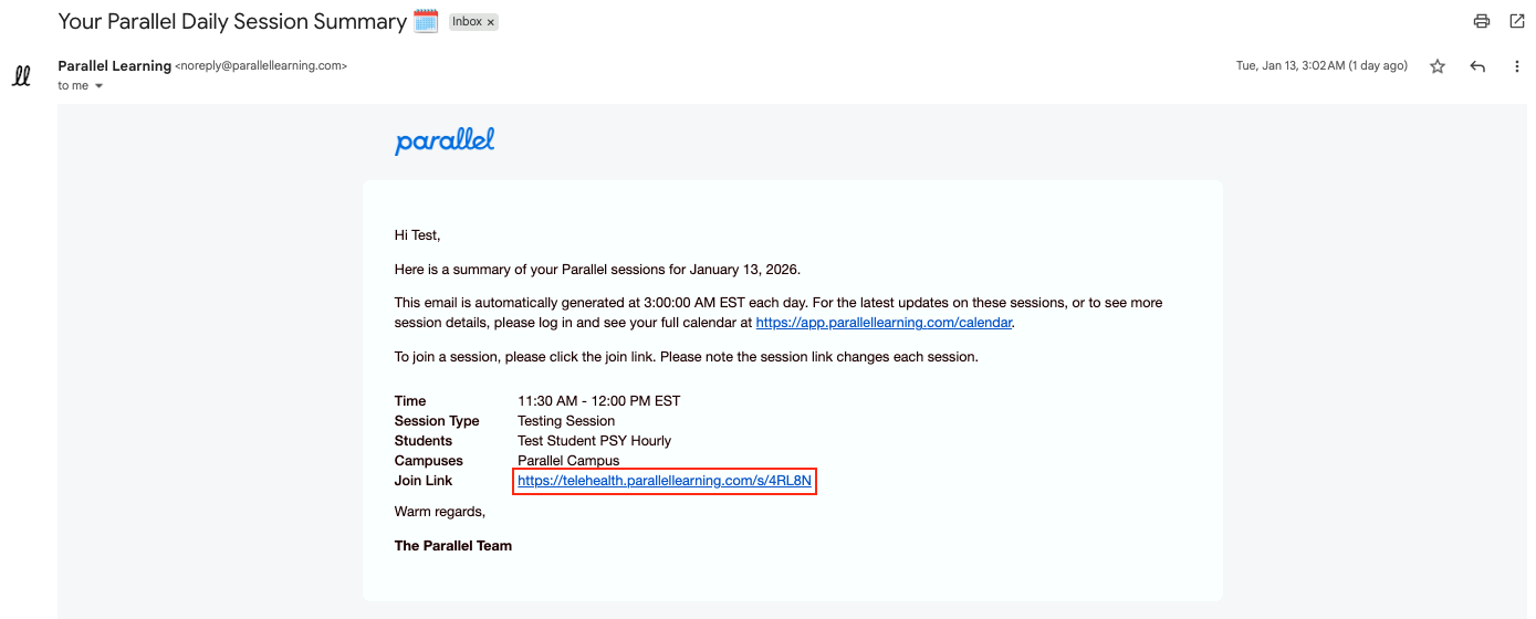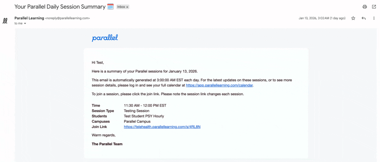 | Note: We suggest bookmarking the link on the students' devices for easy access. If you encounter an error while joining a session, please email support@parallellearning.com immediately and inform the Provider about the issue. |