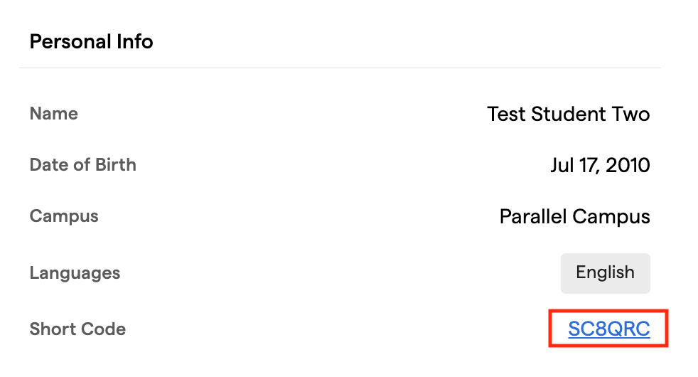 To join via the Student Short Code, you must first navigate to the specific student's profile. To do this, you can select the Student tab in the top options bar and then select the name of the specific student. The student's short code will be found in their Personal Info section as shown below: